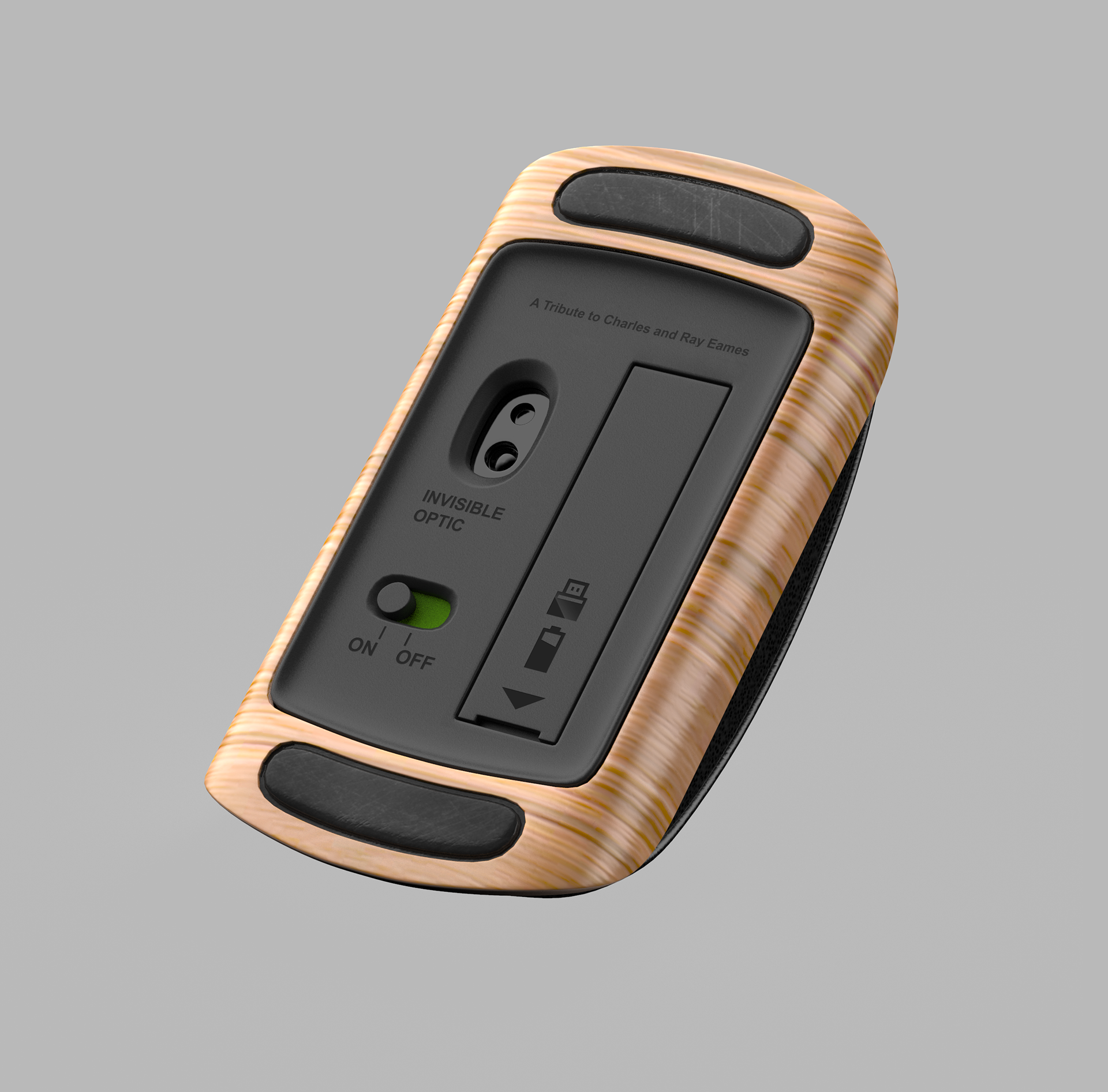 Tired of electronic-look electronics? Inspired by the design classic, Lounge Chair and Ottoman by Charles and Ray Eames, this mouse concept brings a new visual language to the boring office digital product. As paying a tribute to the legendary designers, the design addresses the ergonomics and style of a computer mouse from the perspective of designing furniture. Like a mini version of ottoman part of Eames chair, this mouse, composed with bent plywood, leather, and plastic, blends the boundary between furniture and electronics.